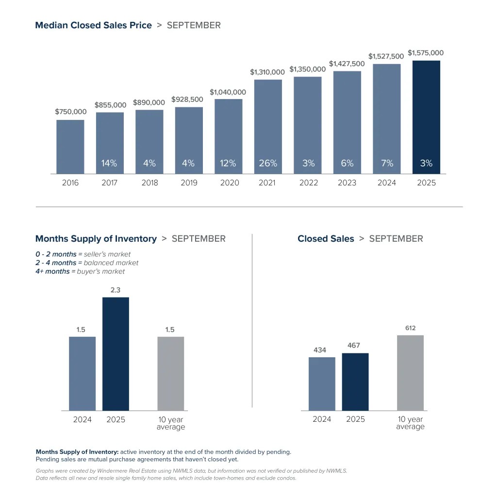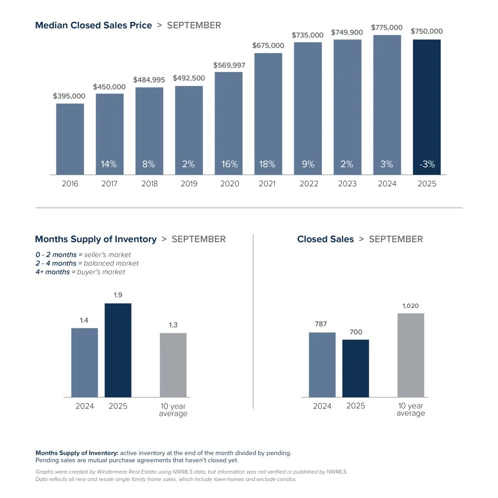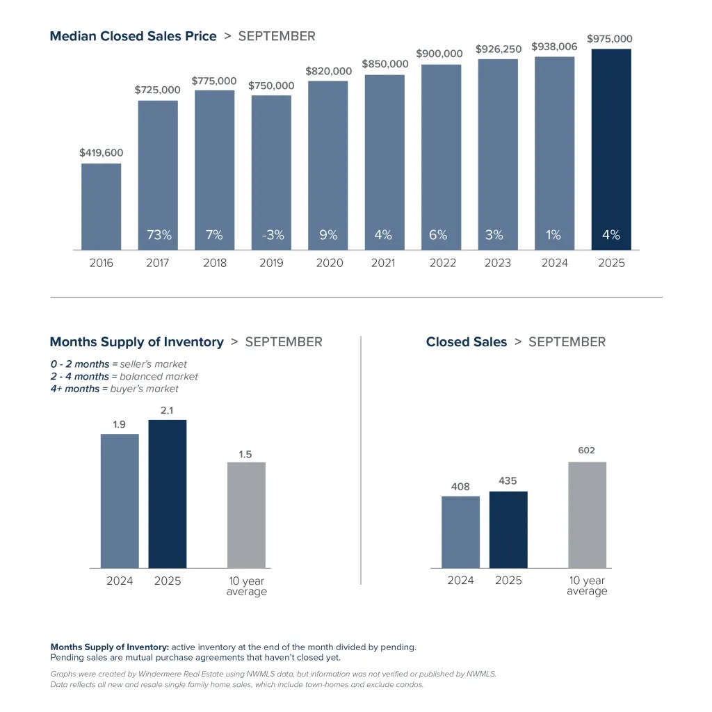 Snohomish County’s single-family median price fell 3% year over year to $750,000, down from $775,000 last September. Inventory surged 39%, but buyer activity didn’t keep pace as closed sales dropped 11% and pending sales slipped 1%. Snohomish County remained the only one of our local markets to favor sellers. In the condo segment, prices declined 9% to $482,500, while inventory rose 55%.